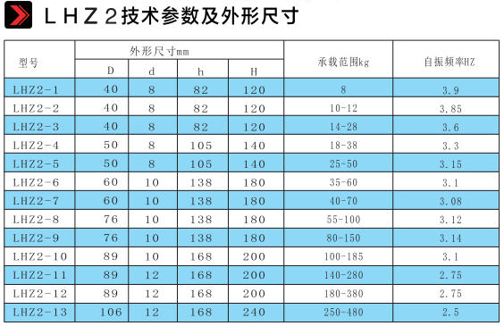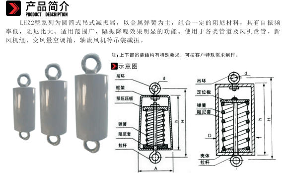 The LHZ2 series are cylindrical suspended vibration isolators, primarily composed of metal springs combined with certain damping materials. They feature low natural frequency, high damping ratio, wide applicability, and significant vibration isolation and noise reduction effects. They are suitable for vibration damping in various types of ducts, fan coil units, fresh air handling units, variable air volume (VAV) air conditioning units, axial flow fans, and other suspended installations.