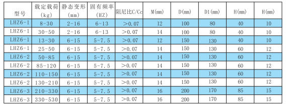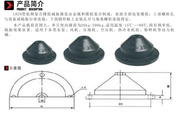 This product has a wide load range, with a single unit's vertical load capacity from 20kg to 500kg. It is suitable for temperatures from -15°C to +80°C, has a low natural frequency, and provides significant vibration isolation.